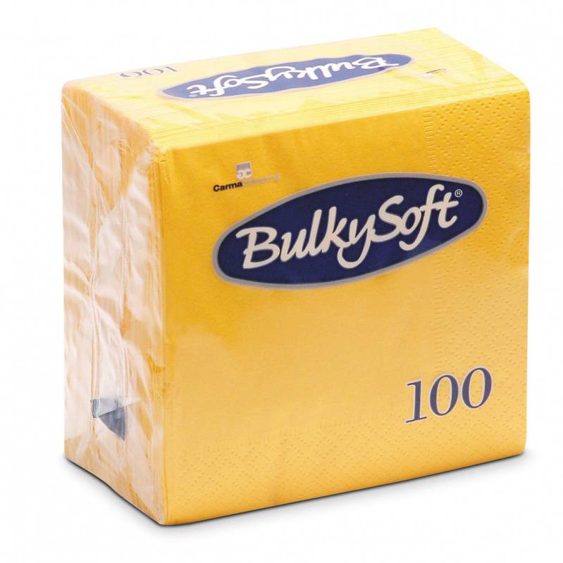 Die Servietten BulkySoft gelb bestehen zu 100% aus Zellstoff. Die Papierservietten sind 2-lagig mit einem 1/4 Falz und randgeprägt. Die Servietten eignen sich zum falten.